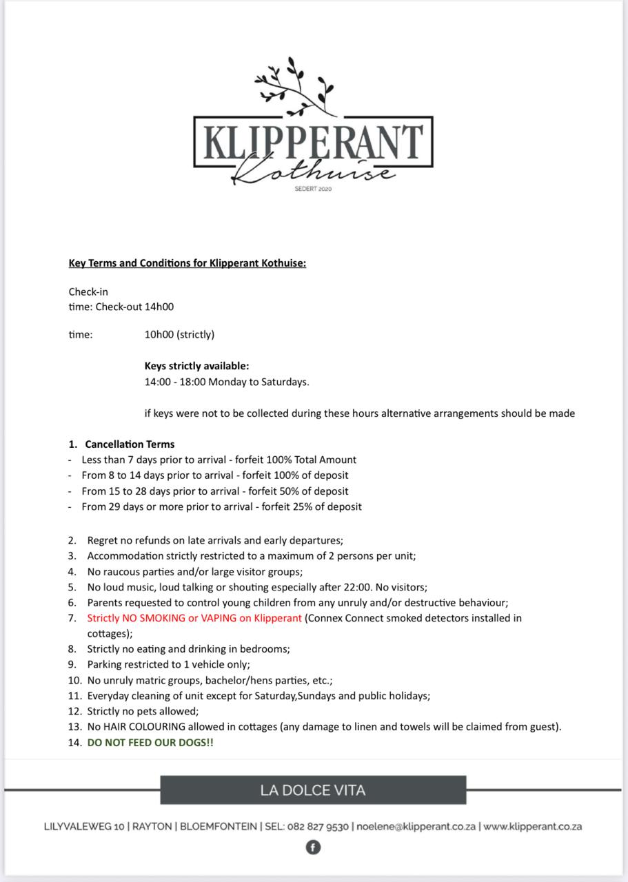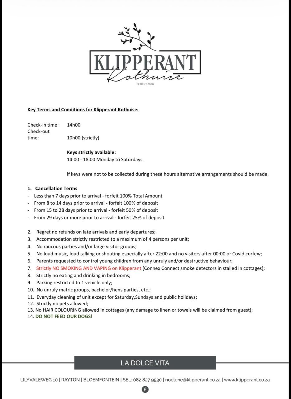 - Please take care of Klipperant Kothuise. You are responsible and liable for any breakages, damages or loss which you cause to the accommodation or its contents.